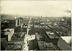 Aerial perspective of the Wholesale District looking south down Meridian Street from the Soldiers' and Sailors' Monument (2015)