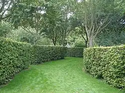 The planting of wildernesses varied considerably, but the most common scheme, as at Ham House, involved hedging around the edges of a "quarter", and trees within. Both elements might be evergreen, but usually were not. The height of hedges varied from the huge ones of the French—some 20 feet at Versailles—to those around shoulder height, but in the 17th century were generally over 10 feet high.[35] In newly-planted wildernesses it would take some years for high hedges to reach their full height. The height of the trees might be kept the same by pruning, or planted and pruned so that they sloped up towards the centre of the quarter in a "pyramid". They were generally small or medium-sized; a few writers recommended fruit trees. They might be of varied species, or all the same (perhaps more common). They might be planted in a regular geometric scheme, or more randomly. Especially in large and late examples, there might be paths leading into the interior of the quarter, but more often it was fully enclosed, although there were no doubt small gaps left for the gardeners to push through for maintenance.[36]