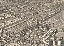 The wilderness was planted close, but not too close, to the main house, often beyond the parterres, or at an oblique angle to the garden front; garden critics often complained they were too close or too far.[2] If there was a far-reaching view from the house, the wilderness was not supposed to obstruct it,[3] but if the garden adjoined buildings, obstruction of the view to these might be an advantage. Generally the garden front of the house opened to a terrace followed by an area set out in parterres, often including "plats" of plain grass. Wilderness areas would be beyond or beside this.[4]
