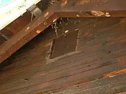 Wildfell is a simplified Federal style, with a molding over the boxed eaves, which is repeated on the porch above its octagonal pillars. The six-paneled front door in a plain frame is topped by a four-light transom. Windows have 6/6 lights behind louvered shutters. The stairway has two turned balusters on each step under a walnut handrail. Double parlors are separated by pocket doors. Original kitchen and dining room spaces are to the rear. Perhaps unique to this house are the exterior and interior load bearing walls whose construction is of narrow (1”x7”) oak planks laid horizontally, nailed from above as the work proceeded, forming a virtually solid 7” wall thickness. The construction method is visible beneath the shutters of the false windows to the left of the front door. The window placement would have opened out from the side of the staircase, but is placed to complete the symmetrical appearance of the house. Floor joists are hand hued timber beams set in a cross pattern and cross joined by lesser beams.