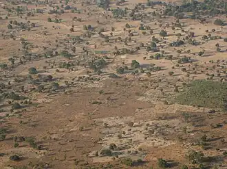 Approximately 15% of the country has forest cover while wooded land constitutes approximately 34% of the area. Very little closed forest can be found and this is mainly of the gallery forest type along waterways. The open forests include savanna of four types, namely Sahelian, Sahelian-Sudanian, Sudanian, and Sudanian-Guinean.[13] Though much of the country is dry and sparse, vegetation can vary considerably. Northern Burkina Faso consists mainly of savanna, acacia woodland, and during the wet season, prickly shrubs and stunted trees flourish.[1] Herbaceous plants include broadleaf deciduous, shrub, desert shrub, semi-desert savanna and thorny scrub. Crops include banana, cassava, bougainvillea, cotton, guava, maize, spinach, Malabar spinach, millet, onions, papaya, sorghum, tomatoes, and yams. Most of the country consists of sparse savanna grasslands, with the occasional shrub or acacia. Although the country only has about 15% forest cover overall, there are many forests in the south, growing denser along the banks of the perennial rivers.[1] These include Diéfoula Forest, Logoniégué Forest, Laba Forest, Dida Forest, Koulbi National Forest, Bontioli Reserve Forest, Nabere Partial Reserve Forest, Koflandé Forest, Maro Forest, Tui Forest, Deux Balés Forest, Kalio Forest, Tisse Forest, Dibon Forest, Pâ Forest, Mou Forest, Boulon Forest, Tigo Forest, Nakambe Forest and Niangoloko Forest, of which about 16% have official protection.