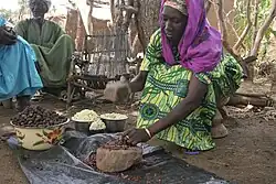 Trees of note include the shea tree (known as karité in the local Dioula language and the baobab.[1] Although the shea tree is indigenous to the semi-arid Sahel region of West Africa, Burkina Faso contains the largest number of them.[3] The shea tree is extremely important to the Burkinabe people and is termed as "women's gold" by the villagers, because the nuts of shea tree can be collected and then processed by crushing and grinding to yield shea butter, important in cuisine and in exports, for use in the manufacture of chocolate and cosmetics such as soap.[3] Shea nuts are the country's third most important export, after cotton and livestock; in 1997, an average tonne of unprocessed shea nuts sold domestically for CFA70,000 (US$980) and overseas for CFA1,00,000 (US$1400).[3] The most important centres of shea butter production are in Sissili Province and Ziro Province.[3] The bark of the tree is also used as an ingredient in traditional medicines and the shell of nut is said to be able to repel mosquitoes and is also said to protect existing trees.[3] The Bambara groundnut (Vigna subterranea) is also grown in abundance; Burkina Faso produced some 20,000 tonnes in 1989, after peanuts (160,000 tonnes) and cowpeas (74,000 tonnes).[19] Between 1982 and 1985, an attempt was made to improve the Bambara groundnut, an initiative which involved the participation of plant breeders in the Grain Legumes Programme.[19]
