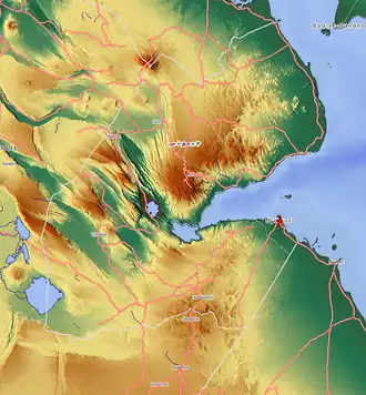 The Day Forest National Park is a woodland habitat, which includes part of the forest mass of the Goda mountain massif. The Goda mountain's forests, the east face of which is part of the park, is considered a "spectacular natural oddity ... rare species of green on Djibouti's parched map like a giant oasis".[10] It is located 30 kilometres (19 mi) west of the Gulf of Tadjoura. The Goda Mountains, which rise to a height of 1,783 metres (5,850 ft), lie northwest of the Gulf of Tadjoura, Afar Region and forms Djibouti's largest vegetated area. The park protects at least four known endemic plant species. The forest is dominated by such trees as Juniperus procera, Olea africana, Buxus hildebrandtii, and Tarchonanthus camphoratus. Distribution of the plants in the park varies with elevation. Vegetation above 950 metres (3,120 ft), where the topography is rugged, consists of those species already mentioned. Vegetation below 950 metres (3,120 ft), which has the benefit of better water sources, consists of Buxus hildebranti, Terminalia brownie[11] and Acacia spp.[12][13]
