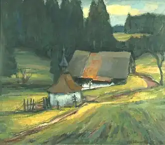 Although, as a result of these trips, he created landscapes depicting those southern areas Kimmich soon returned to his proper motifs, i. e. the Black Forest and its people. Since the middle of the 1950s he "completely refurbished" Black Forest painting from a stylistic point of view. This accomplishment determines Kimmich's standing in the history of art in the southwest of Germany.[1]