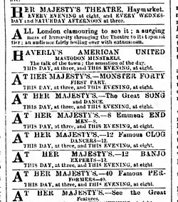 Huntley was especially engaged to play banjo for the blackface Haverly's United Mastodon Minstrels in London, and led the group's big banjo act in which twelve performers appeared at one time.[1][18][15] He gave a first performance at Her Majesty's Theatre on July 31, 1880 and remained three months.[1] During this period, Huntley had the honor of appearing before the Royal Family.[1] Afterward, he played in the principal cities of England and in Paris.[1] He left Europe later in 1880 and arrived in Memphis, Tennessee on December 30, to fill out his contract with Mr. Haverly's "New Mastodon Minstrels."[19]