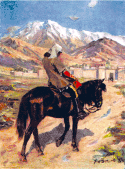 Surgeon Brydon was one of twelve mounted officers who had become separated from the remnants of the main column before the final stand at Gandamak. This small group had ridden to Futtehabad, but half had been killed there while six escaped. All but Brydon were killed, one by one, further along the road as their horses became exhausted.[7] Both Brydon and his pony were wounded in the course of encounters with small Afghan parties. On the afternoon of 13 January 1842, the British troops in Jalalabad, watching for their comrades of the Kabul garrison, saw a single figure ride up to the town walls. It was Brydon. Part of his skull had been sheared off by an Afghan sword, and he survived the blow because he had stuffed a copy of Blackwood's Magazine into his hat to fight the intense cold weather. The magazine took most of the blow, saving the doctor's life.[8]