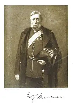 William was born in Blackburn House, Ayr, the tenth of eleven children of his father John was Laird of Boreray and came from the Macleans of Ardgour and on his mother Jesse's side from the MacLeods of Dunvegan. He grew up with home tutors before going to the Dollar and Edinburgh Academies. He joined the University of Edinburgh in 1829 and received the medical license in 1832 and MD in 1833. He worked on ships to Bombay and Java as a physician and spent some time studying in Paris. After joining the Madras Medical Service in 1838 he was attached to the 55th Regiment at Secunderabad. In 1840 he served in Chusan during the opium wars. In 1842 he served with the 18th Royal Irish and then with the 1st Madras Fusiliers at Arcot. He then served in Jabalpur and then moved to Calcutta where his brother worked with Lord Ellenborough. He was offered a civil position through the influence of Lord Ellenborough, but he refused to leave medicine which was his primary interest. In 1845 he became a Resident Surgeon at the Hyderabad Court and was involved in organizing a medical school. The fourth Nizam of Hyderabad Nawab Nasir-ud-Daulah was treated for diabetes by Maclean through diet changes after local practitioners failed to help. This led the Nizam to look upon the system of western medicine more highly and ordered the establishment of a medical school under Maclean. The first seven successful students produced in the school were made taluk physicians.[1] George Smith took over the medical college in December 1854. Maclean moved to Netley in 1860 he moved to the newly founded Army medical school at Netley on the invitation of Sidney Herbert, with advice from Florence Nightingale on suitable terms.[2] He was posted as professor of military medicine and taught there until 1886.[3] At Netley, he was involved in reducing the weight of the gear of army soldiers so as to improve health, a major concern having been heart disease.[4][5] Maclean was against the issue of alcohol in rations to army soldiers.[6] He also supported an amalgamation of the medical services in the British and Indian armies in India which had been separated on racial lines.[7]