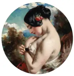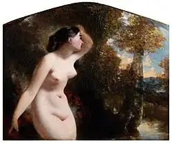 William Denholm Kennedy, born at Dumfries on 16 June 1813, was educated in early life at Edinburgh. When seventeen years of age he came to London, and in 1833 entered the school of the Royal Academy. Here he began a lifelong friendship with William Etty, RA, who sensibly influenced his style as an artist. In 1833 he sent his first pictures to the Royal Academy, A Musical Party and The Toilet, and continued to exhibit there almost every year until his death. In 1835 he won the Academy gold medal for an historical painting, Apollo and Idas, and in 1840, being awarded the travelling allowance, went to Italy, where he spent two years in study at Rome. He returned with many sketches and studies of Italian scenery, and an Italian influence was subsequently visible in his work, especially in such pictures as The Bandit Mother, The Italian Goatherd, The Land of Poetry and Song, and others. Kennedy, however, failed to fulfil his early promise, and his work deteriorated. He died suddenly at his house in Soho Square on 2 June 1865.[1]