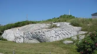 The work depicts thirty-two fishermen and their wives and children enveloped by the wings of the guardian angel St. Elmo. It also features the image of Peggy, a legendary late-18th century shipwreck survivor deGarthe believed gave her name to the village. deGarthe bequeathed the sculpture to the province of Nova Scotia and it can be viewed in a park located behind his former home.[13]