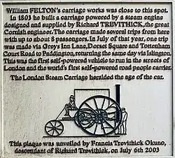 William FELTON's carriage works was close to this spot. In 1803 he built a carriage powered by a steam engine designed and supplied by Richard TREVITHICK, the great Cornish engineer. The carriage made several trips from here with up to about 8 passengers. In July of that year, one trip was made via Greys Inn Lane, Dorset Square and Tottenham Court Road to Paddington, returning the same day via Islington. This was the first self-powered vehicle to run in the streets of London and the world’s first self-powered road people carrier. The London Steam Carriage heralded the age of the car. This plaque was unveiled by Francis Trevithick Okuno, descendant of Richard Trevithick, on July 6th 2003.[8]