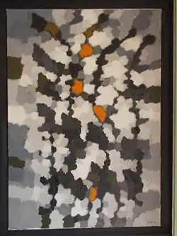 Between 1947 and 1950 Gear lived and worked in Paris,[3] where he met Eduardo Paolozzi, Alan Davie, Stephen Gilbert and many of the leading post-war generation of Parisian artists including Atlan, Da Silva, De Staël, Dubuffet, Hartung, Mathieu, Pignon, Poliakoff, Schoffer, Singier, Soulages and Zadkine. In 1948 he held his first Paris and London solo exhibitions, and visited Terry Frost, Patrick Heron, Roger Hilton, Peter Lanyon and Bryan Winter in St Ives. After meeting Appel, Constant, Corneille, and Jorn, he joined and exhibited with the North European avant-garde CoBrA art group[2] in Amsterdam during 1949. That year he also co-exhibited with Jackson Pollock in New York, married an American citizen, Charlotte Chertok (1920–88), and his son David was born. While holidaying in Brittany in 1950, he was visited by William Scott.