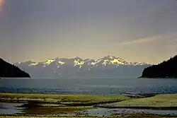 The bay is situated 45 miles (72 km) northwest of Juneau on the western portion of the Lynn Canal.[5] It is about 0.75 miles (0.65 nmi; 1.21 km) long and about 4 cables — i.e., about 960 yards (880 m) — in width. The Beardslee River flows down a few cascades into its head.[6] About 4 miles (6.4 km) northwest of the bay is the Endicott River, coming in from the west through a narrow, deep gorge in the mountains.[7]