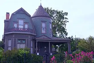 The two-story, Colonial Revival-style house has a circular tower and wraparound porch characteristic of Queen Anne style architecture.[3]
