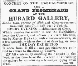 In 1825–1826 he worked in Boston, Massachusetts, setting up an exhibition known as the "Hubard Gallery" at Julien Hall (corner Congress and Milk Streets).[2] At the time Hubard would have been about 18 or 19 years old. A local newspaper reported "there is a great variety of pictures—likenesses, groups of animals, landscape scenery, caricatures, &c.—all cut with a simple pair of scissors, without the aid of any machinery whatever, and which a spectator might, at a hasty glance, take for painting."[3][4][5] He received raves in the press: "He exercises his scissors with so much dexterity and skill, that an accurate profile, even of the most 'unmeaning face,' can be procured in twenty-five seconds, without the use of steam."[6] Local resident John George Metcalf visited the gallery in 1825, and wrote in his diary: