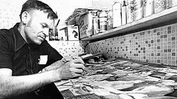Kurelek graduated from high school in 1946, and enrolled in the fall of that year in the Arts General Course at the University of Manitoba, graduating with his degree in May 1949.[13] By this time the family farm had been sold and his father had moved the family to Vinemount, Ontario near Hamilton.[14] Kurelek had developed an early interest in art, which was not encouraged by his hard-working parents. Despite this, he enrolled at the Ontario College of Art in Toronto. His explanation to his father was that there was money to be made in commercial art. In fact, he had no intention of going into commercial art. During this time, he worked at odd jobs to support himself, such as at a carwash on University Ave. At the OCA, he found himself to be the only student with a university degree. Here, he studied the great contemporary Mexican artists: Diego Rivera, David Alfaro Siqueiros, José Clemente Orozco. His innate appeal and love of murals may have originated in his boyhood, when in his absence his father ventured one day upstairs and into his son's room to discover, much to his horror, the walls covered in unseemly illustrations.[15]