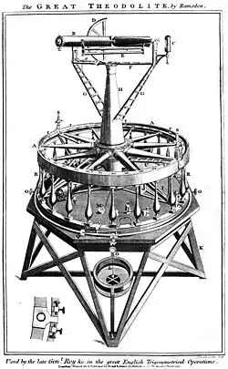 The main survey instrument from 1802 for the primary triangles was a Great Theodolite made by William Cary. This was very similar to the instruments used in France and Britain for previous trigonometrical surveys. It had a horizontal circle that was 36 inches (91 cm) and the readings were taken using a microscope. The vertical graduated circle was 18 inches (46 cm) in diameter.[10] It weighed about half a ton and needed twelve men to carry it. Lambton measured all three angles of triangles in several cases to establish the spherical excess (angles of triangles on a sphere sum up greater than 180°). When the survey was carried out from Madras to Bangalore, Lambton was able to compare the Bangalore baseline of 1804 with the calculated measurements and the difference was about 3.5 inches (8.9 cm).[15]