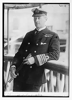 Promoted to full admiral on 5 November 1908,[12] he became Commander-in-Chief, Home Fleet, with his flag in the battleship HMS Dreadnought, in March 1909.[13] In that capacity he encouraged innovative ways of organising his huge fleet including the deployment of cruising formations, the use of fast squadrons and tactical command at squadron level rather than fleet level.[1] He was advanced to Knight Grand Cross of the Royal Victorian Order on 31 July 1909.[14] He went on to be Commander-in-Chief, Plymouth in April 1911 and was advanced to Knight Grand Cross of the Order of the Bath on 19 June 1911.[15] He was promoted to Admiral of the Fleet on 20 March 1913.[16]