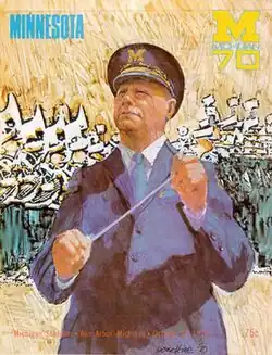 In 1935 Revelli was hired by the University of Michigan as director of bands.[1] Revelli almost decided against applying for the Michigan job because the pay was significantly lower than what he was earning in Hobart, but he did apply for and later accept the job,[2] a position he held for 36 years. Revelli retired in 1972 and was director emeritus until his death in 1994,[1] Under his direction, the Michigan Marching Band was acclaimed for its musical precision, intricate formations and high-stepping style. The Marching Band under Revelli was "the first to score original music to band shows, to synchronize music and movement, to use an announcer, to do a post-game show, and the first to host a high school Band Day."[10]