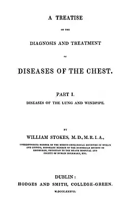 William Stokes FRS MRIA (1 October 1804 – 10 January 1878) was an Irish physician and Regius Professor of Physic at Trinity College Dublin. He graduated from the University of Edinburgh Medical School with an MD in 1825, later returning to practice in Dublin at Meath Hospital. He went on to create two important works on cardiac and pulmonary diseases – A Treatise on the Diagnosis and Treatment of Diseases of the Chest (1837) and The Diseases of the Heart and Aorta (1854) – as well as one of the first treatises on the use of the stethoscope. He emphasised the importance of clinical examination in forming diagnoses, and of ward-based learning for students of medicine.