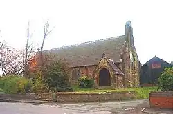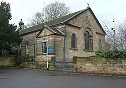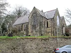 The foundation stone of this church was laid on 25 July 1868 by Rev. Charles Musgrave,[94] and it was consecrated on 25 February 1870.[95][96] It had two 1871 stained glass windows by Edward Burne-Jones and other windows by Dante Gabriel Rossetti and Ford Madox Brown. The remains of these windows are now at Cliffe Castle Museum.[97] When opened it had a west window with heads of four evangelists and four prophets, a bell turret, a sedilia, lectern, chancel tiles, pulpit and font.[95] The building was demolished in the 1970s.[97][98][nb 5]