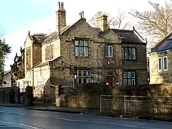 This is a Grade II listed building.[108] There is a picture of the building on its Images of England listing page.[109] It is situated near St Albans Presbytery off Dudwell Lane, Skircoat Green, Halifax, West Yorkshire HX3 0AT, and it was designed by Barber at a building cost of £2,300 in 1861, before Barber and Mallinson began their professional partnership.[110][111] It is a large, two-storey, gabled, detached house built in Gothic Revival style of coursed stone with ashlar dressings and bay windows. The left-hand chimney stack has a panel inscribed "1861." Inside, the stairway has "bulbous turned balusters and newels plus moulded hand rail."[109] It was later sold by the Church of England, and became Stafford Hall, then became a retirement home. As of 2010 it was under the control of Calderdale Council and had become dilapidated.[112][113] By 2014 the building had been renovated and had re-opened as a children's home.[114] There is no public access to the building.[nb 9]