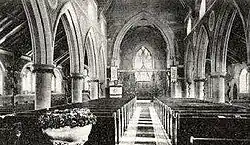 The church was built with a nave, chancel and north and south aisles. The nave and chancel together make a six-arch arcade, with a 22 feet (6.7 m) wide chancel arch. The west tower is 20 feet (6.1 m) square, with walls 3 feet (0.91 m) thick. The ground floor ceiling which doubles as the floor of the bell-ringers' chamber in the tower is made of heavy beams and moulded joists; this could testify to a consciousness of the fragility of parishioners and the weight of the bronze bells hanging high above. Barber designed all the original 1878 interior fittings. The nave and chancel ceilings are of open pitch pine woodwork. The interior was built in plain manner, apart from richly carved corbels supporting the chancel arch, the Four Evangelists carved over the priest's door in the south aisle and the rich bas-relief carving of the Caen stone pulpit with scenes from the life of St Paul. The pews in the nave and aisles, the choir stalls and screens were all of pitch pine, and the floor covered with plain encaustic tiles. The pews were still there in 1986.[10][145] The tower contains eight bells which were cast and hung in 1880.[146] The sanctuary was remodelled in 1928 by diocesan architect Sir Charles Nicholson.[147][148][nb 15]