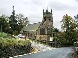 This is a Grade II listed building on Whitehall Road, Drighlington, West Yorkshire.[10] Barber designed this Gothic Revival building in 1876 at a cost of £7,400 as a replacement near the site of an earlier Moravian Church of 1797, which he demolished in January 1878, having possibly re-used some of the stone.[143][144] It was consecrated at 11.30 am on Friday 26 April 1878 by the Bishop of Ripon who called the church "beautiful," and the Leeds Mercury commented on the attractive "plain but massive" structure. The consecration was attended by a large congregation which retired directly afterwards to luncheon in the local schoolroom, where Barber was given a vote of thanks for his work.[145]