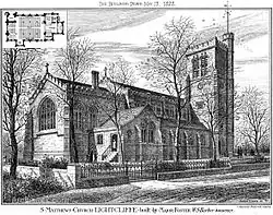 This was a Grade II listed building which had a spire.[100] It was sited on the corner of Lister Lane and Rhodes Street, Halifax, West Yorkshire.[101] It was designed by Mallinson & Barber to accommodate a congregation of 800, at a building cost of £10,000, and consecrated on 4 July 1870 by the Bishop of Ripon. It contained an organ built by William Hill. In 1952 the congregation was joined with St James to become the combined Church of St Mary and St James. The church was declared redundant and closed in 1986, and was demolished in 2001 and replaced by a housing development.[100][102][103][nb 7]