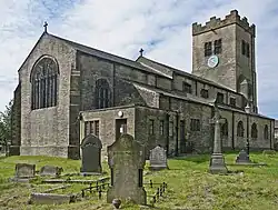 This is a Grade II listed building.[99] This Gothic Revival Anglican church in Marsh Hall Lane, Thurstonland, Huddersfield, West Yorkshire, was designed between 1868 and 1870 by Mallinson & Barber.[5] It is built of hammer-dressed stone with ashlar dressing. The stone gutter of the slate roof is on moulded brackets. The tower is at the east end of the nave, and it has a stair turret and a splay-footed stone spire. Over the south door is a canopied niche with a "moulded arched head and figure" beneath. Inside there is an arch-braced hammer beam roof and an 1871 square font standing on four marble colonnettes.[6][nb 6]