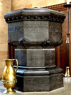 Barber reinstalled the original east window's stonework, and put in stained glass by Powell of Leeds.[157] A Caen stone credence table was built into the south wall of the chancel, there was new heating and gas lighting, and all windows had been replaced. Gill & Co. were the stonemasons. Items donated by the congregation were the altar cloth, altar rails and standards, alms dish and collecting bags, brass pulpit desk and lights, oak chairs, brass lectern and a new font carved by sculptor George Dyson of Crosland Moor.[13][158][nb 19]