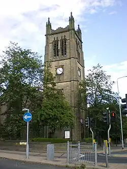 Huddersfield Parish Church is a Grade II listed building on Byram Street, Huddersfield, West Yorkshire.[115] There has been a church on this site since the 12th century, and it was rebuilt 1834–36 by James Pigott Pritchett.[116][117][118][119][120][121] Barber effected an interior re-ordering of this building at a cost of £2,500 in 1873, as follows. The box pews were replaced by open and cushioned stalls, and the gallery seats were cleaned and painted. The old pulpit was replaced with one of carved oak in Gothic design. There was new flooring of encaustic tiles made by Maw's and laid by W and S Thornton of Huddersfield. John Brook of High Street, Huddersfield, did the painting; possibly decorative fresco or stencilled work. There was gas lighting by brass standards and wall brackets.[122] The whole of the woodwork, including stalls, pulpits, screens (including the screen work in the north and south transepts) was designed by Barber and carried out under his supervision. James Christie was the sole contractor for all the woodwork, and Joseph Shaw was one of the sub-contractors for the carving, working under Christie.[71][nb 10]