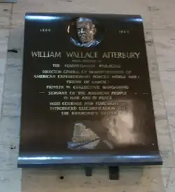 Between August 1917 and May 1919, Atterbury supervised construction of harbor facilities and a portion of the railways in France that were assigned to the U.S. Army for maintenance and operation.[8] The troops in France gave him the nickname of "General Attaboy" and he was also known as "The Railroad General."[5][9] Atterbury was discharged from military service on May 31, 1919, and returned to civilian life in Pennsylvania.[3]
