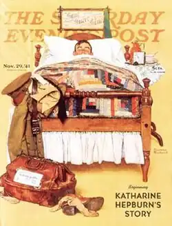 Willie Gillis was a freckle-faced All-American character who served as one of Rockwell's main coverboys during World War II.[15] The Gillis character is widely referred to as an everyman who epitomized the typical American World War II soldier.[16][17][18][19] Rockwell created Gillis in 1940 as the European Theater of World War II was escalating and Americans were enlisting or being drafted into the armed forces under the Selective Training and Service Act of 1940. Rockwell credits the name Willie Gillis to his wife,[20] who derived it from the old nursery rhyme Wee Willie Winkie.[1] Rockwell described Gillis as "an inoffensive, ordinary little guy thrown into the chaos of war".[6] The public identified with Rockwell's portrayal of the "little guy" living up to a sense of duty in this time of war.[6] Gillis was truly seen as the typical G.I.,[19] and Rockwell's wartime art remains quite popular: his signed original May 29, 1943 depiction of Rosie the Riveter sold at a Sotheby's auction on May 22, 2002, for $4,959,500.[21] Some of the Willie Gillis paintings and the Rosie the Riveter painting were raffled off during the United States Department of the Treasury's Second War Loan Drive,[21] which ran from April 12 – May 1, 1943.[22] The Gillis character endures generations later for literary and artistic comparison.[15]