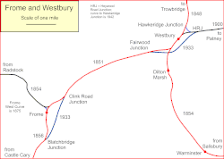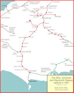 Opened to Westbury 1848; to Frome 1851; to Yeovil 1856; and to Weymouth 1857.