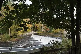 The site was adapted in 1900 for the production of hydroelectric power. This included the construction in 1912 of the present concrete dam, which was done to increase the site's generating capacity. The hydropower facility was abandoned in the 1940s, and the impoundment created by the dam was later used by the town as part of its water supply. The town acquired the property in 1967, and has landscaped it to present some of the architectural remnants of the mills which operated here.[2]