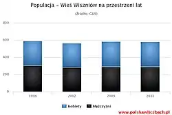 In 2011, the population was 584, making Wiszniów the second largest village in the Mircze commune. Half of the community is women and half are men. From 1998 to 2011, the number of inhabitants decreased by 1.5%. 60.3% of the inhabitants of the village of Wiszniów are in working age, 20.5% in pre-working age, and 19.2% of residents are in post-working age. There are 65.9 people of non-working age in the village of Wiszniów per 100 people of working age.[3]
