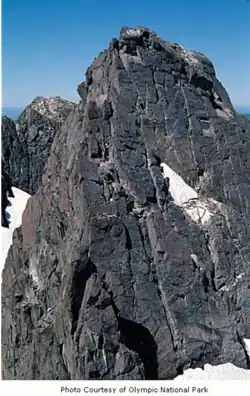 The Olympic Mountains are composed of obducted clastic wedge material and oceanic crust, primarily Eocene sandstone, turbidite, and basaltic oceanic crust.[7] The mountains were sculpted during the Pleistocene era by erosion and glaciers advancing and retreating multiple times.
