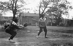 Perhaps the best known young woman playing baseball in the early 1920s was Rhode Island's Lizzie Murphy. She was the first woman to play baseball against major league players, in 1922.[20] A first baseman, she played for the Providence (RI) Independents, and was praised by newspaper reporters for her fielding skills. Sportswriters said she was every bit as talented as a male player, and noted that she was paid $300 a week, more than many minor league players of the 1920s received.[21] Murphy, who had begun playing baseball when she was only ten, had dreams of becoming a major league player, but she was not able to achieve that goal.[22] She did in 1922 become the first female baseball player to play against major league players, in a game that was a charity exhibition pitting all-star players from the New England and American Leagues against the Boston Red Sox.[23][24] She was also able to have a long career in the semi-pro leagues, leading a touring team that played all over the eastern United States. According to newspaper accounts, she developed a loyal following, with numerous fans who came out to watch her and her team play.[25] Lizzie Murphy's baseball career lasted from 1918 to 1935.[26]