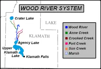 The Wood River watershed drains 220 square miles (570 km2) forest land in the Cascade Mountains southeast of Crater Lake and the Wood River Valley. The drainage around its headwaters is forest country dominated by ponderosa pine and lodgepole pine with some quaking aspen in meadow lands. Annie Creek drains steep alpine forest country. From near its headwaters to the border of Crater Lake National Park, the creek has cut a deep canyon through the forest that is a well known feature within the park. After leaving the park, Annie Creek flows into flat meadow lands on the western border of Sun Pass State Forest. Annie Creek also feeds several irrigation canals including Scott Ditch, Shattuck Ditch, Loosely-Streeter-Cardwell Ditch, and Copeland Lateral Ditch. Excess flow from these canals is returned to Annie Creek and the Wood River. The lower Wood River flows through pasture land and ultimately opens into a large marsh before draining into Agency Lake.[1][3][4]