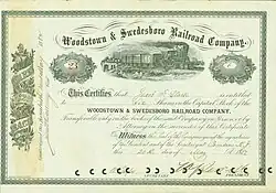 Share of the Woodstown & Swedesboro Railroad Company, issued 20 May 1882