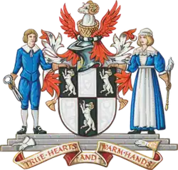 The coat of arms was first granted in 1464,[21] and the supporters were added in 1986. The arms are "on a field of six pieces Sable and Argent three Rams salient armed and unguled Or" and feature sheep, which provided much of the raw material for gloves. The supporters are a male apprentice of the Glovers' Company, and a Sempster (a sewing woman) dressed circa 1638.[22]