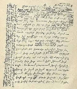 Wounds of Armenia (Armenian: Վերք Հայաստանի, romanizedVerk’ Hayastani)[a] is an 1841 historical novel by Khachatur Abovian. Written in the Araratian (Yerevan) dialect,[4] Wounds of Armenia is considered Abovian's masterpiece.[2][5] It is Abovian's debut novel, the first Armenian novel[6][b] and the first modern Eastern Armenian literary work.[8][9] Thanks to Wounds of Armenia, Abovian is acknowledged as the founder of the modern Eastern Armenian language.[2][5]