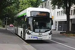 The GB Kite Hydroliner FCEV has proven most popular in Germany, with Wrightbus set to deliver up to 130 in left-hand drive configuration to German operators by the end of 2025. A first batch of 31 Hydroliner FCEVs were delivered to Cologne municipal operator Regionalverkehr Köln during 2024, Wrightbus' first European order since the bus builder was rescued from bankruptcy,[13] with an additional 29 due for delivery in 2025.[14] Twelve were delivered to WestVerkehr in April 2025 for service in Geilenkirchen in North Rhine-Westphalia,[15] while due for delivery during 2025 include an order for 28 Hydroliner FCEVs placed in February 2024 by Saarbahn for service in Saarbrücken,[16][17] 46 for Cottbus municipal Cottbusverkehr,[18] and five for Vestische Straßenbahn in Herten.[15]