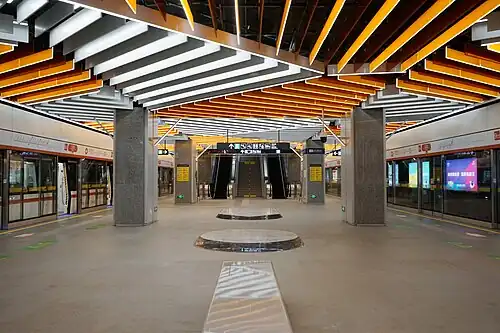Wubao Station is positioned as an international exchange center, providing a platform for various global interactions. The design of the station's central section features a prism-focused motif on the ceiling, while the floor is composed of a mosaic of colorful stones, symbolizing the convergence of the city's diverse elements.[3]