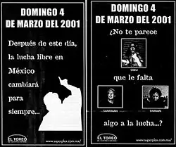 Ocampo and Flores also signed ECW wrestlers Super Crazy, Nova and Yoshihiro Tajiri (who was about to start working for WWE[4]), and former ECW stars Sabu and Juventud Guerrera. X-LAW also established ties with Último Dragón promotion Toryumon, booking for the show almost all his students at the time, who then integrated Toryumon 2000 Project (T2P). Another working relationship started with International Wrestling Association from Puerto Rico. IWA promoter Víctor Quiñones travel to Mexico with then IWA Heavyweight Champion Ricky Banderas and taped many segments for his IWA TV show.[5] Two main events were announced: Hijo del Santo vs. Perro Aguayo, and Sabu vs. Damián 666 in a match for the XPW Heavyweight Championship. The card also featured the first ever ladder match in Mexico, with Rey Misterio, Sr. and Halloween vs. El Mosco and Depredador. The show was heavily promoted in Luchas 2000 magazine and in other publications like La Afición newspaper[6][7] and the Tijuana based Frontera daily[8] The show was held on March 4, 2001 gathering a crowd of 7000 people.[9][10]