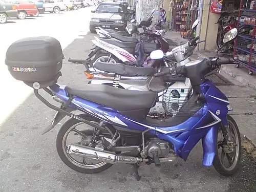 Lagenda 110cc - (2003–2005) The Lagenda 110cc was simply the SR Lagenda with increased engine displacement. However, a few changes have been to the model, such as a more rigid chassis with slightly longer wheelbase and a more straight inlet tract from the carburetor to the inlet manifold, reducing the "puddling" effect. The moped is sold at RM4,388 for the kick-start version and RM4,688 for the electric version. In motor sports, the Lagenda 110 has gained a very good reputation as a racing machine because the bike had won almost all podium position for every rounds during the Malaysian Cub Prix.