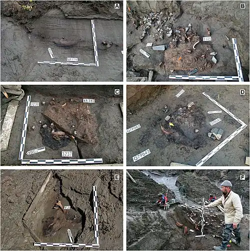 Human teeth, dated to around 31,630 calibrated years before present, were found at the site, at the Northern Point locality.[9] DNA extracted from two of these teeth, which came from two unrelated males, were found to represent a distinct archaeogenetic lineage in a study by Sikora et al. (2019), which they named Ancient North Siberians (ANS).[1][19] This lineage can be modelled as a descendant of early West Eurasians (Kostenki-14-related), with significant admixture (c. 22% to 50%) from early East Asians (Tianyuan-related). The Yana population is estimated to have split from Early West Eurasians around 38,000 years ago.[a]