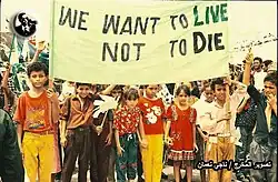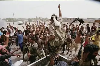 Southern leader al-Beidh seceded and declared the Democratic Republic of Yemen (DRY) on night of 21 May 1994.[20] Secession was greeted with celebratory shots fired into the sky by Southern forces defending the capital, Aden.[21] Saleh responded by calling on Islamists to support his cause, with several factions coming to the aid of the North, and put forward the slogan "unity or death."[22][3] No international government recognized the DRY.
