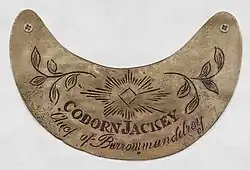 Brass breast plate presented to the Aboriginal leader Coborn Jackey of the Burrowmunditory tribe by the squatter James White.[6] The artifact is held in the museum at Young.