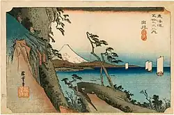 Yui-shuku in the 1830s, as depicted by Hiroshige in the Hōeidō edition of The Fifty-three Stations of the Tōkaidō (1831–1834)